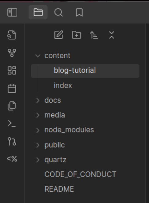 We can then navigate to our quartz folder and create our vault there. To confirm you have opened up the folder correctly, your file structure in the left of obsidian should look similar (it will likely have nothing in the content folder however).