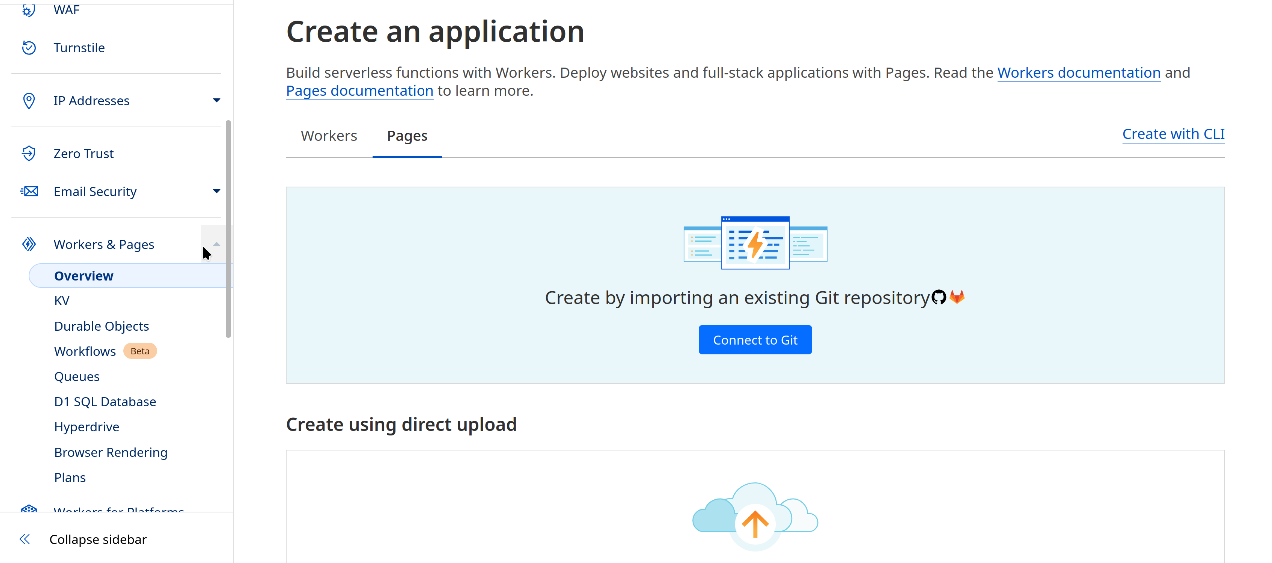 Now that we have our blog code in GitHub we can now get it hosted on the internet! Once we are logged in and are on the Cloudflare dashboard we can head down to “Workers & Pages > Overview > Pages” and find the following screen.
