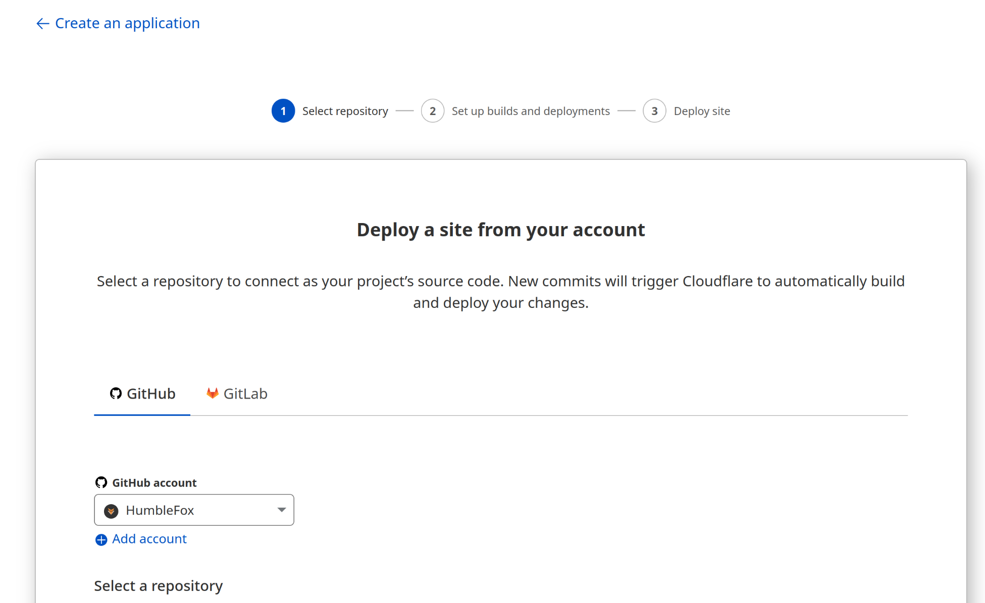 Go through the steps provided to connect your GitHub account to Cloudflare and stop once you get to the following page.