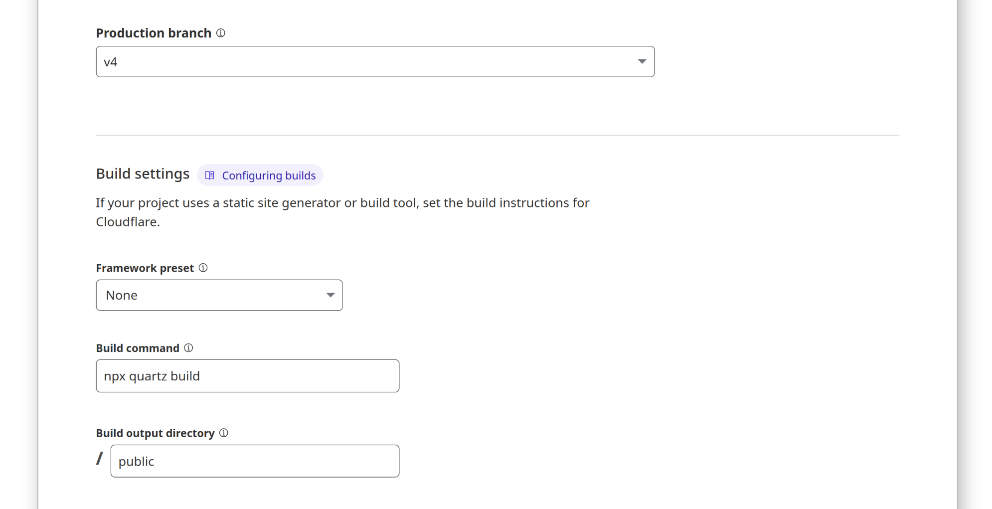 Down below we will select the repository we set up in the previous step and click “Begin Setup”. In the next step you will want to ensure that the production branch we are using is v4 which is the branch that npx quartz sync --no-pull created for us. Quartz is not officially supported by Cloudflare pages which is why we will not be using a framework preset. The build command npx quartz build will be run by Cloudflare each time we deploy our site and was the same command we used earlier to view our page locally but we are excluding the option --serve. The “build output directory” is the directory where Quartz stores all of the html files that were compiled from our markdown files.